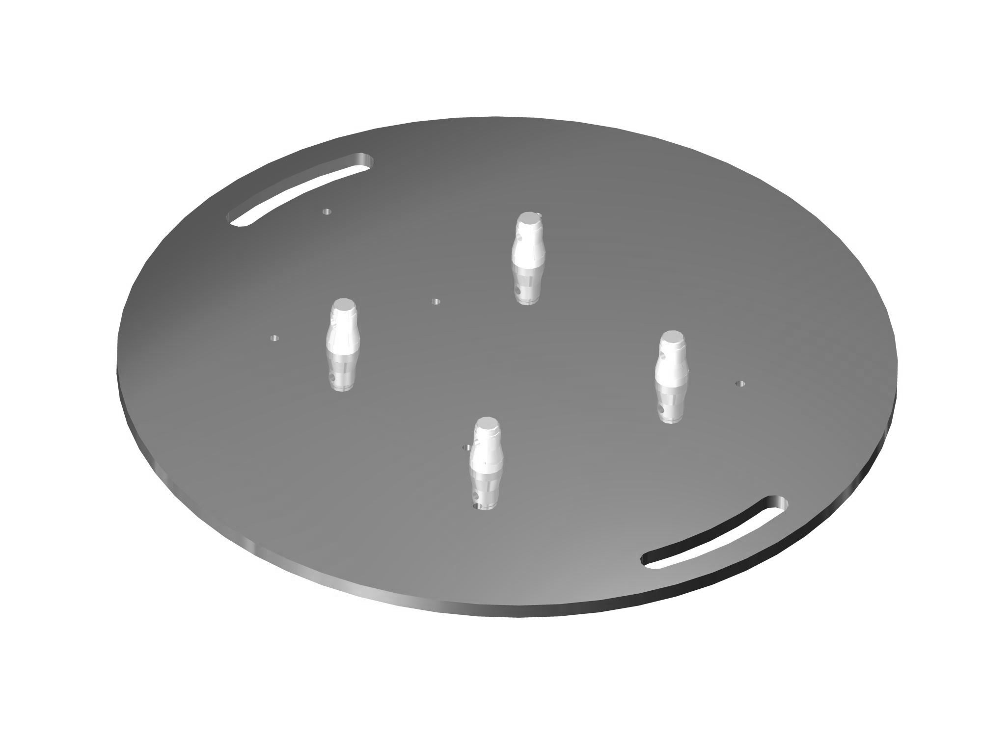 Plaque de base ronde en acier pour DT 33, 34, 43 et 44. Matériau: acier | incl. demi-connecteurs. Inclus dans la livraison: 4 demi-cônes, 4 broches en acier, 4 clips de sécurité. Longueur: 650 mm. Largeur: 650 mm. Hauteur: 15 mm (sans cône). Poids: 37,5 kg.